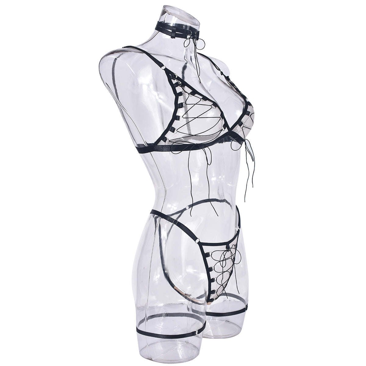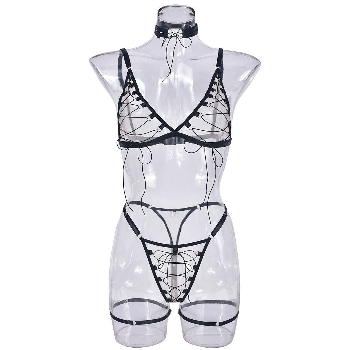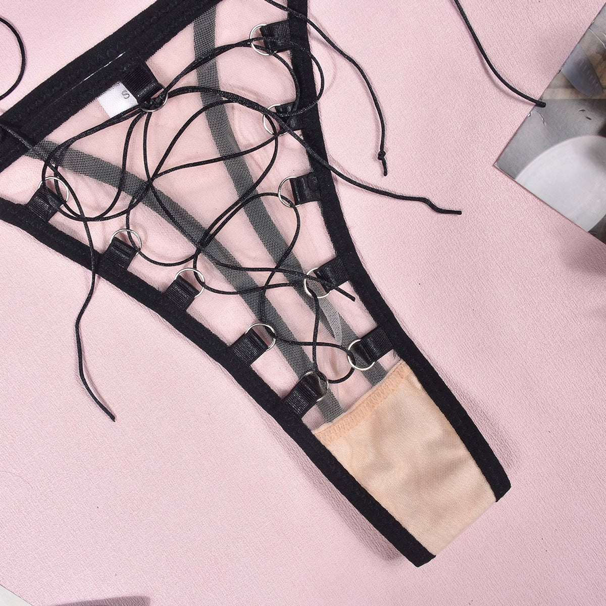 Sexy Lingerie Mesh See-through Complex Lace-up Uniform Four Piece Set Women Crisscross