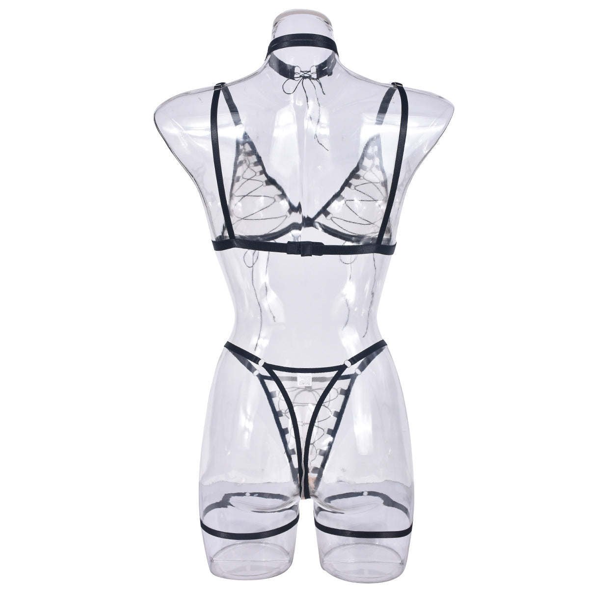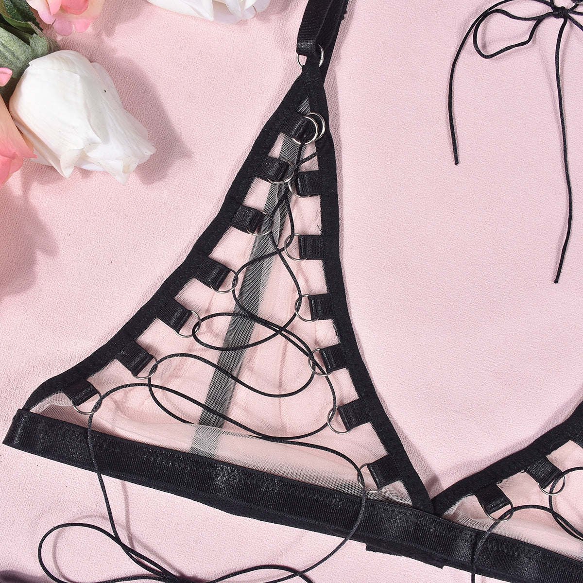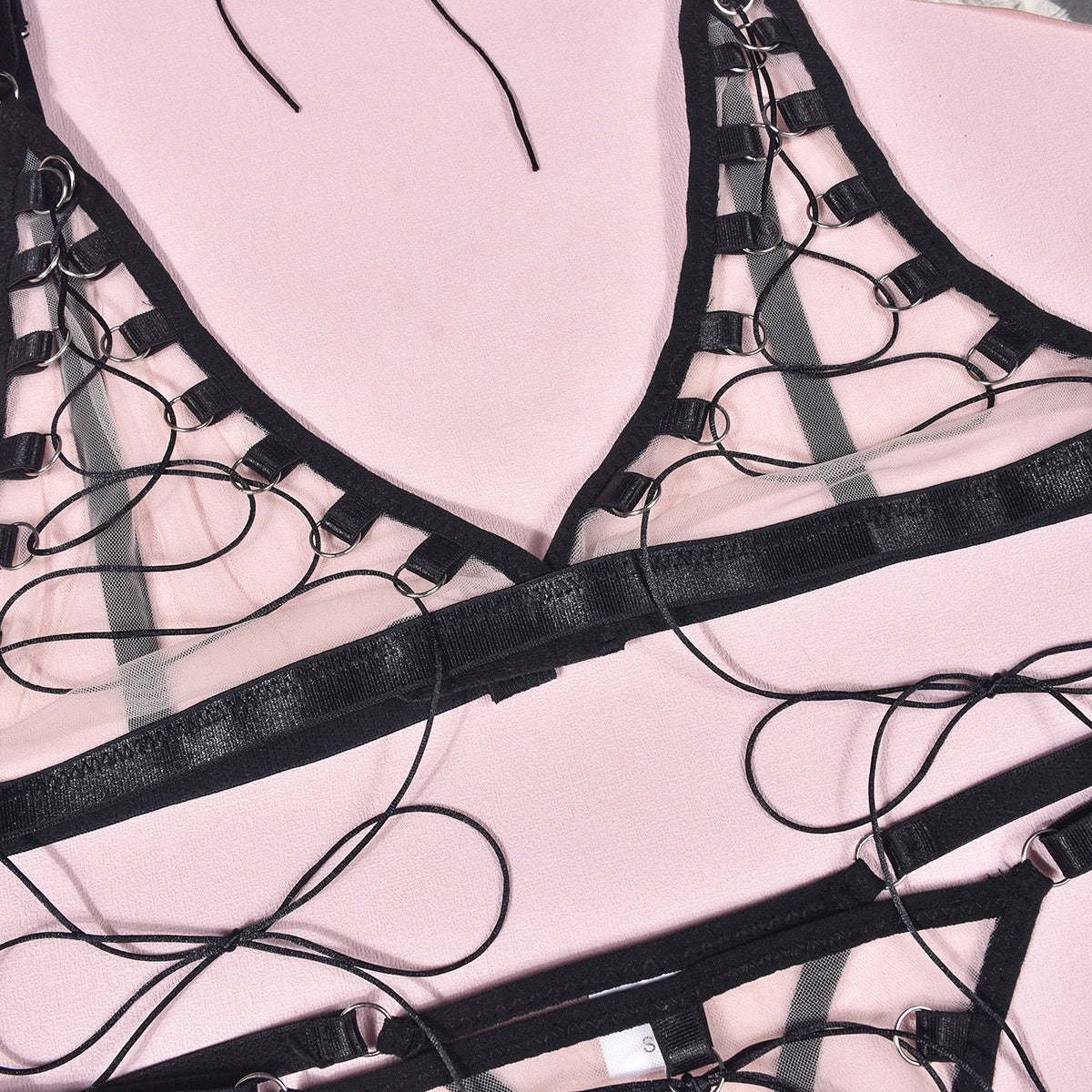 Sexy Lingerie Mesh See-through Complex Lace-up Uniform Four Piece Set Women Crisscross